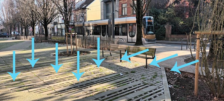 Dans ce projet, il n’ y a pas de noues ou d’autres dispositif d’infiltration particulier: la perméabilisation de cette grande surface suffit à avoir des effets positifs importants car il y a moins de rejets d’eaux de pluie à l’égout et plus d’infiltration dans le sol tout en permettant la verdurisation et ses externalités positives. Les fosses d’arbres dépourvues de bordures contribuent aussi à absorber l’eau de pluie. Ici le fond des fosses est abaissé, ce qui permet aux arbres de stocker plus d’eau en cas de forte pluie.